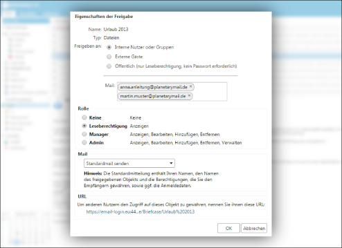 Nach dem gleichen Konzept wie bei Mails oder Kalender können Sie gespeicherte Daten teilen.