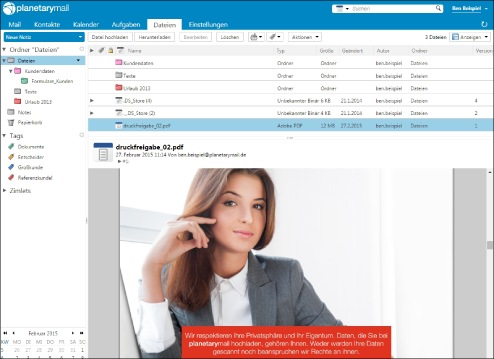 planetarymail beinhaltet anfangs 25 GB Speicherplatz. Nutzen Sie diese auch um Daten online, in Ihrer persönlichen Cloud vorzuhalten. Mit wenigen Klicks sind diese hochgeladen. Dank der Möglichkeit Ordner anzulegen verlieren Sie nie die Übersicht. Einfach und schnell können Sie diese Dateien auch teilen. Ihnen steht ein komplettes Rechtemanagement zur Verfügung. Im Gegensatz zur US-Amerikanischen Konkurrenz müssen Sie uns Ihre Daten dabei nicht schenken.